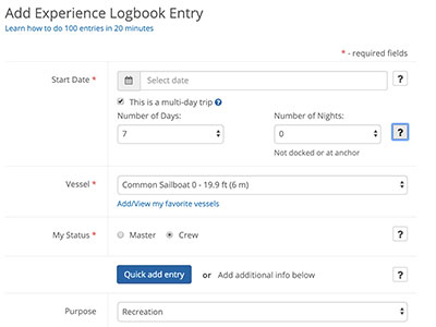 If the trip was over multiple days then click the multi-day checkbox. It will ask how many days and nights. NOTE that nights is actual sailing through the night. NOT at the dock or at anchor. Multi-day trips appear in your logbook as such which is good information for a yacht charter company that you have done a multiday trip before.